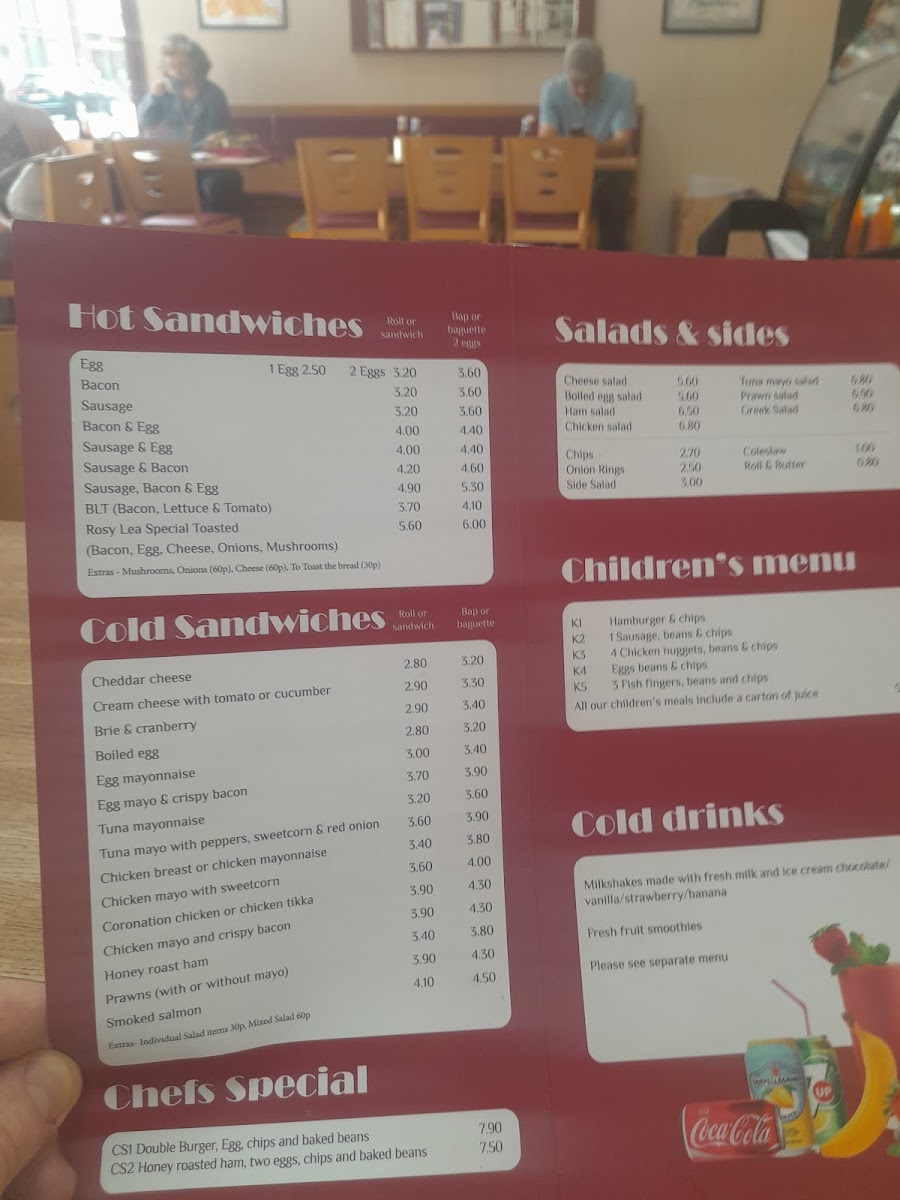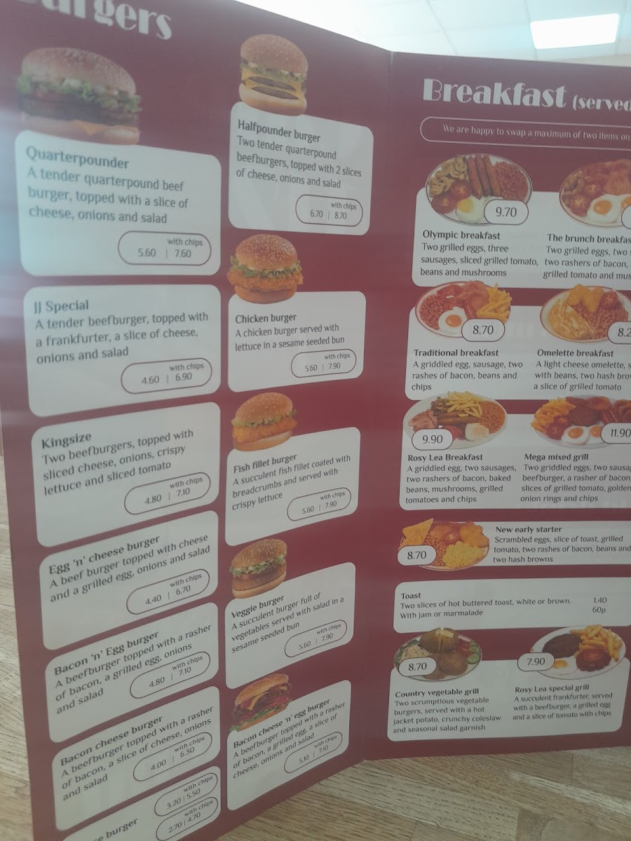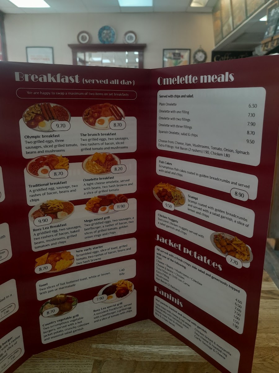 Summing up the Rosy Lea Cafe menu feels like stepping into a comfort‑food lover’s dream, with an array of hearty options that span from classic breakfasts to indulgent burgers. Morning choices include the likes of the Olympic Breakfast, Traditional Breakfast, Rosy Lea Breakfast Toast and The Brunch Breakfast, alongside a variety of omelettes such as the Plain Omelette, Omelette With One Filling, Omelette With Two Fillings, Omelette With Three Fillings and Spanish Omelette served with Salad & Chips. For a more casual bite, the burger section features the Quarterpounder, Halfpounder Burger, JJ Special Chicken Burger and the larger Kingsize. Jacket potatoes come in several toppings including Beans, Cheese, Cheese And Beans and Cheese And Coleslaw, while paninis range from Tuna Mayo With Cheese & Red Onion to Mozzarella With Tomato & Onion, Honey Roast Ham & Cheese, Brie & Crispy Bacon and Chicken Tikka And Mozzarella. Hot sandwiches like Egg, Bacon & Egg and Sausage & Egg share space with salads such as Cheese Salad, Tuna Mayo Salad, Boiled Egg Salad, Prawn Salad and Ham Salad. The children’s menu keeps things simple with classics like Hamburger & Chips, 4 Chicken Nuggets, Beans & Chips, 3 Fish Fingers, Beans And Chips and more, while cold drinks feature Fresh Fruit Smoothies. Chef’s specials such as the Double Burger, Egg, Chips And Baked Beans and other options like the Egg ’N’ Cheese Burger, Bacon ’N’ Egg Burger and Bacon Cheese Burger round out a menu that’s generous, familiar and unpretentious.