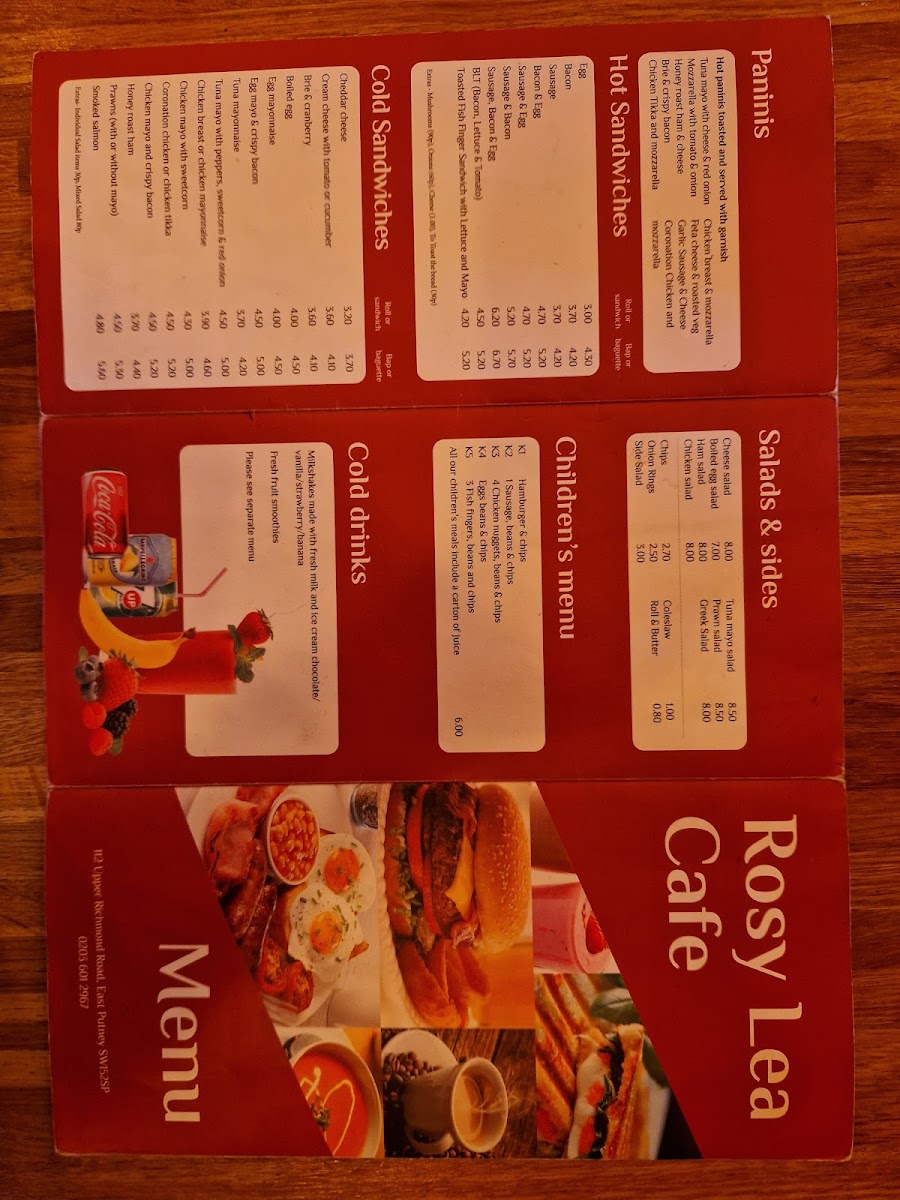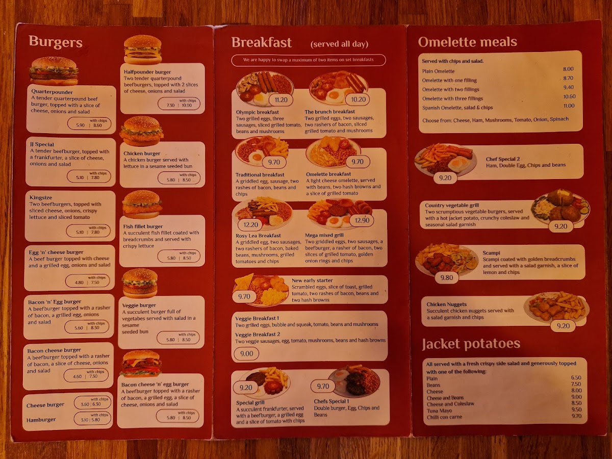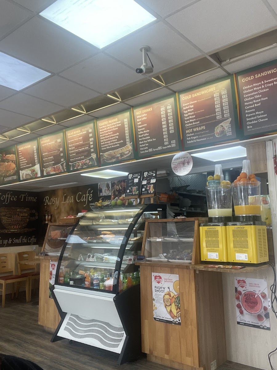 Summing up the Rosy Lea Cafe menu feels like stepping into a comfort‑food lover’s dream, with an array of hearty options that span from classic breakfasts to indulgent burgers. Morning choices include the likes of the Olympic Breakfast, Traditional Breakfast, Rosy Lea Breakfast Toast and The Brunch Breakfast, alongside a variety of omelettes such as the Plain Omelette, Omelette With One Filling, Omelette With Two Fillings, Omelette With Three Fillings and Spanish Omelette served with Salad & Chips. For a more casual bite, the burger section features the Quarterpounder, Halfpounder Burger, JJ Special Chicken Burger and the larger Kingsize. Jacket potatoes come in several toppings including Beans, Cheese, Cheese And Beans and Cheese And Coleslaw, while paninis range from Tuna Mayo With Cheese & Red Onion to Mozzarella With Tomato & Onion, Honey Roast Ham & Cheese, Brie & Crispy Bacon and Chicken Tikka And Mozzarella. Hot sandwiches like Egg, Bacon & Egg and Sausage & Egg share space with salads such as Cheese Salad, Tuna Mayo Salad, Boiled Egg Salad, Prawn Salad and Ham Salad. The children’s menu keeps things simple with classics like Hamburger & Chips, 4 Chicken Nuggets, Beans & Chips, 3 Fish Fingers, Beans And Chips and more, while cold drinks feature Fresh Fruit Smoothies. Chef’s specials such as the Double Burger, Egg, Chips And Baked Beans and other options like the Egg ’N’ Cheese Burger, Bacon ’N’ Egg Burger and Bacon Cheese Burger round out a menu that’s generous, familiar and unpretentious.